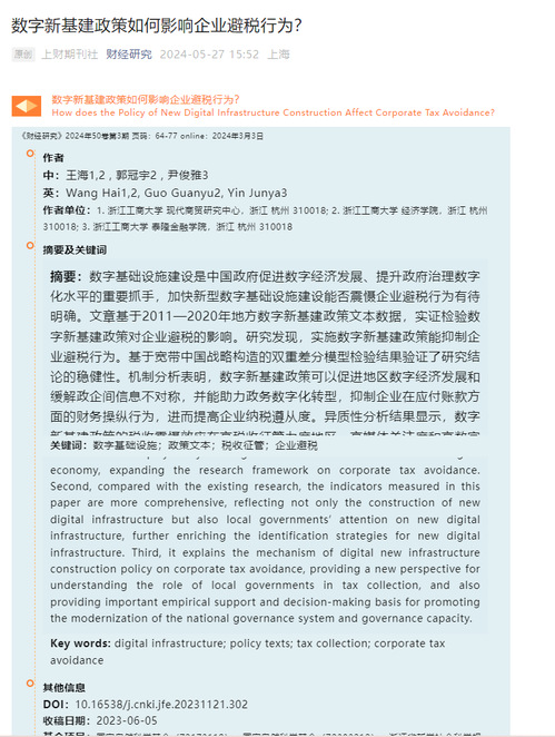 在线赌博网站教师尹俊雅博士为通讯作者的论文《数字新基建政策如何影响企业避税行为?》在《财经研究》期刊正式发表。